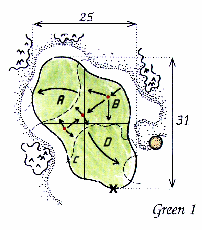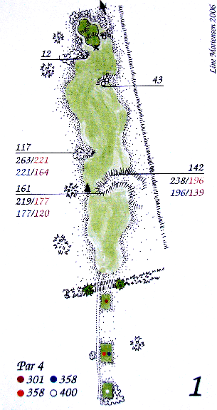 "Et langt drive lidt i højre giver bedste position for 2. slaget til green, men pas på fordybningen i fairway. De to bunkers kort af green kan gøre afstandsbedømmelsen til green svær i 2. slaget. Green har fra midten bagfald, så vær ikke for agressiv i tilslaget til green"