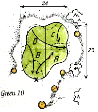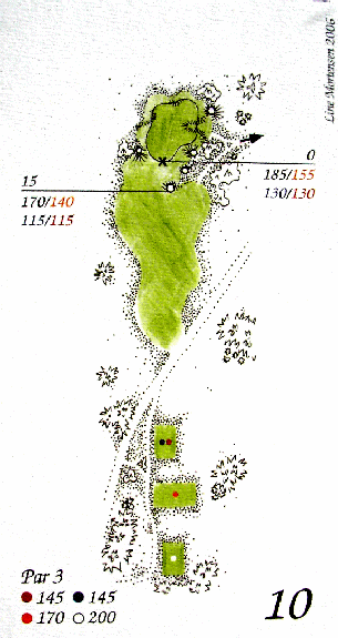 "Green er beskyttet af bunkers langs højre side, men bolden kan trilles på green venstre om disse. Green har en drilsk "kløft" i bagerste højre side, som splitter for- og baggreen. Står flaget i bagkant, gør man klogt i at gå et jern op."