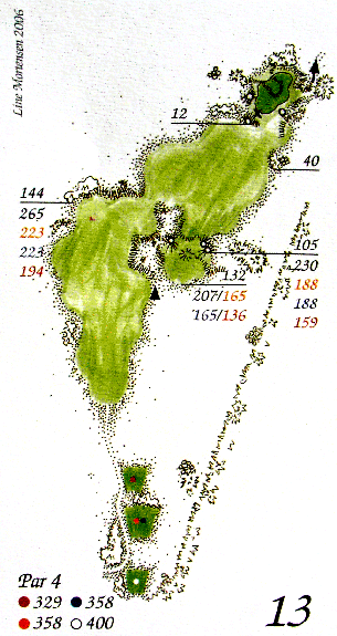 "Den sikre rute er ned ad fairwayen i venstre, men slå man efter fairwaysnippen i højre mellem bunkers opnås en klart bedre indgangsvinkel til den drilske green."