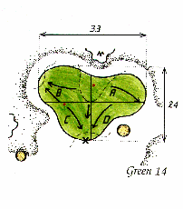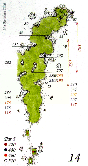 "Fairwayen kan synes broderet med forhindringer men frygt ikke - der er god plads. Drive efter spikesklyngen midt i fairway eller lige venstre eller højre om denne, hvis du er meget langslående. Afstanden til green kan snyde pga. bunkeren 23 m før green. Greenfladen er kun synlig, hvis der indspilles fra kort af green i højre."