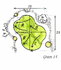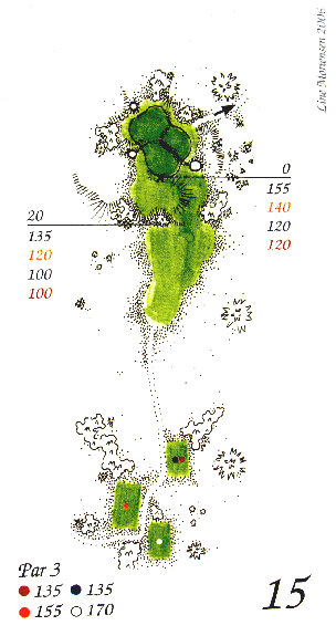 "Vær omhyggelig med valget af kølle for hullet er vindudsat, green ligger lavere end tees og en gruppe spikes kort af green skjuler den egentlige afstand til green. Green er tilmed temmelig onduleret så slå efter den forreste del af green."