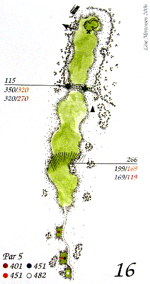 "Drivet er ligetil, men for at ligge godt for 2. slaget skal det placeres midt i fairway for ellers kommer skoven let i spil. Med et godt placeret drive er der dog god mulighed for at nå green i 2. slaget."