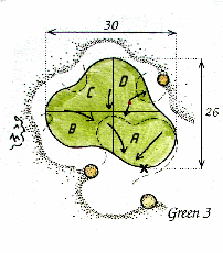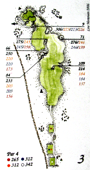 "Dette korte hul kan friste de langtslående til at gå efter green, men den bedste indgangsvinkel til green opnås med et langt drive, over bunkeren i midten af fairway. Pas da på den lille skjulte greenbunker til højre for green i indspillet."