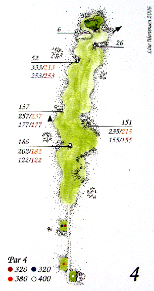 "Har du evnerne så drive over bunkeren midt i fairway og sigt efter bunkeren 52 m fra green. Alternativt spil da ned langs højre side af fairway"
