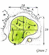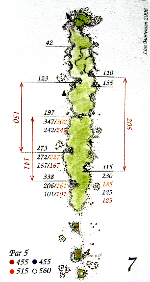 "Et langt drive og et solidt langt 2. slag sætter de 5 bunkers 135 - 110 m før green ud af spil, men er der bare lidt modvind - tænk da kun et slag frem ad gangen. Green er plateau-opdelt så vær opmærksom på, hvor flaget er placeret, når du slår ind til green."