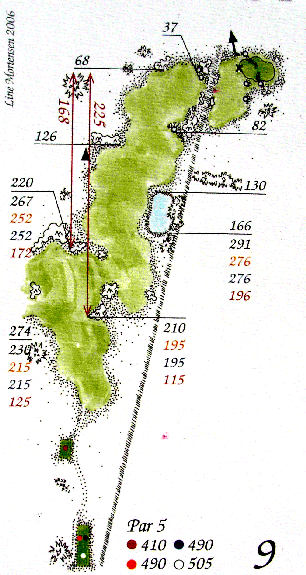 "Hullet har delt fairway så spil enten sikkert til venstre eller sats og slå et langt slag i højre. Med et godt drive kan green nås i to slag, men ønsker man ikke at satse, giver et 2. slag frem i fairwayen i venstre en god indgangsvinkel til green."